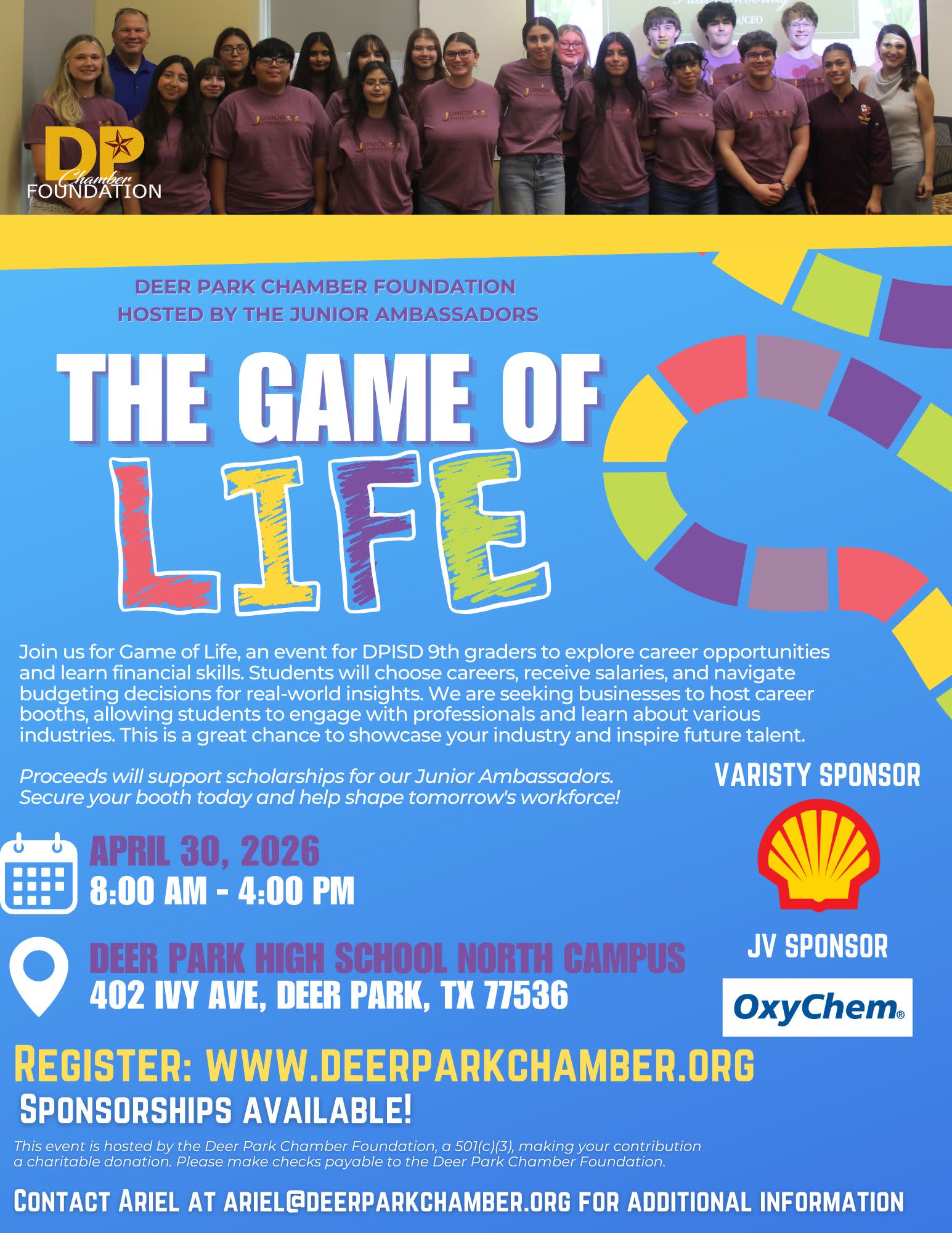 The Deer Park Chamber Foundation Junior Ambassadors host the Game of Life! At this event, DPISD 9th graders will attend a Game of Life where they will first choose a job by walking around different career booths and receive a salary. Students will then visit various budget booths to learn how to handle their finances effectively using their monthly income with the career they picked. A portion of the event proceeds will go to scholarships for Junior Ambassadors. This is hosted by the Deer Park Chamber Foundation, a 501c(3). Please make checks payable to the Deer Park Chamber Foundation.